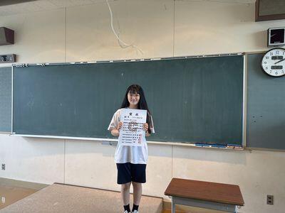 ↓ 全校集会では県中体連から功績賞を、県スポーツ協会から表彰状を贈られた畠山さんの表彰も行い、全校生徒でお祝いをしました。畠山さんのますますの活躍をお祈りしています。