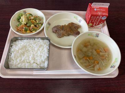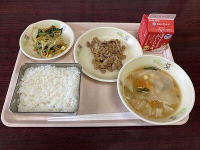 ごはん ねぎ塩豚丼の具 みそ野菜スープ いよかん 牛乳 747㎉