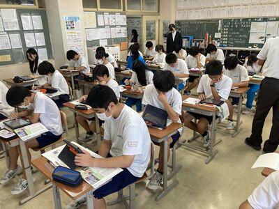 学習テーマは「世界遺産・地域遺産を英語で紹介しよう」です。もちろん英語でです。タブレットを活用しながら、調べ学習を行い、文法に気をつけながら作業を進めていました。白神山地や、万里の長城などをテーマに考えている生徒がいて、英語の時間でありながら様々なことを学べる、とても興味深い学習内容でした。完成が楽しみです。