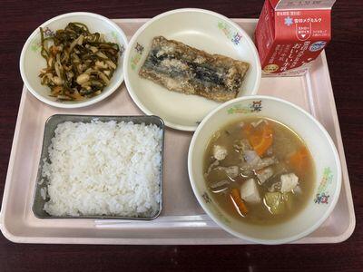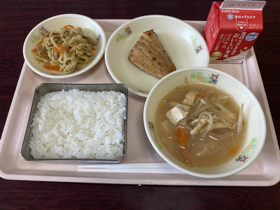 きのこごはん あじのみりん焼き 小松菜のごま和え どさんこ汁 牛乳 732㎉