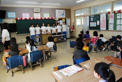 さて、今日は朝会を開き、今日で授業が終了する三浦先生とのお別れの会を持ちました。3校兼務で、非常に大変だったことと思いますが、そんなことはおくびにも出さず、満面の笑顔と明るい口調で、毎時間頑張っていただきました。1年間ご指導いただきありがとうございました。