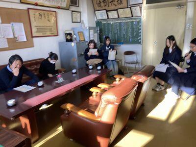 昨日・今日の2日間で、4月の異動で気仙沼市に初めて赴任した先生方を対象とした「市立学校教職員研修会」が開催され、プログラムの最後に伝承館に訪れました。伝承館での館内ガイドを務めたのは、本校の語り部活動に参加している3年の菊田さん、三浦さん、2年の三浦さん、熊谷さんの4名です。その活動の様子を、今年度から語り部に参加する2年生2名と1年生5名が見学しました。