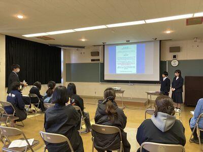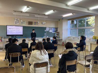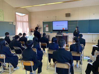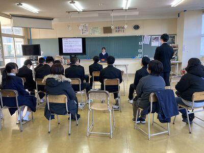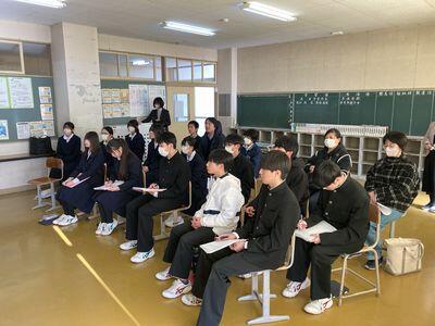 ↓ 修学旅行を控えた3年生が上手に万博の予約を取れるよう、旅行の添乗員さんに説明していただきました。