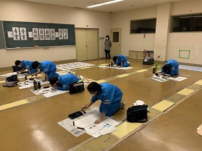 今日は5校時と階中タイムの時間に、校内席書大会が行われました。参加したのは、各学年から選出された代表7名です。開会式のあとに、それぞれが練習で培ってきた力を存分に発揮し、素晴らしい作品を次々と書き上げました。今日完成させた作品から、一人2点を市の書きぞめ審査会に提出します。24日からリアスアーク美術館で行われる市立学校書きぞめ展に出品されますので、ぜひご覧いただきたいと思います。