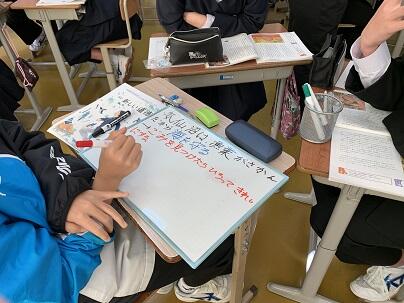 今日は本校に週1ペースでお出でいただいているスクールカウンセラーの羽生先生が、2年生37名に心の勉強会を開いてくださいました。集中力が高まる呼吸法からスタートして、ネガティブ思考との上手な付き合い方について、画像を用いながら丁寧に説明いただきました。