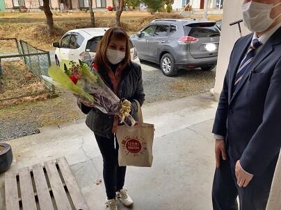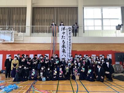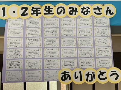 ↓ 3年生からは、義務教育9年間にわたっておいしい給食を届けてくださった本吉共同調理場の皆さんに、感謝のメッセージのプレゼントがありました。