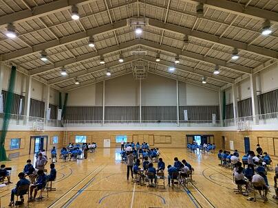地震の避難訓練の後,委員会毎に決められた担当に従って,体育館内の設営をしました。