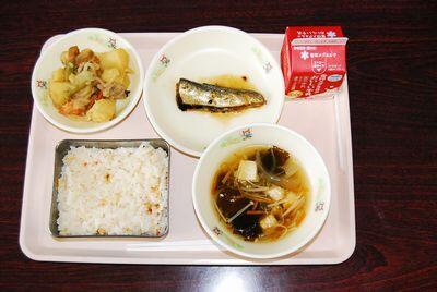 ごはん いわしのみそ煮 ひじきと豆の炒り煮 うーめん汁 牛乳 751㎉