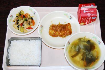 ごはん ヤンニョムチキン 茎わかめのサラダ 米粉ワンタンスープ 牛乳 752㎉