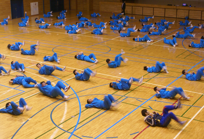 社会の授業の様子です。補習授業は1、2組合同で体育館で行いました。