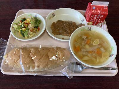 バターロールパン ハンバーグ キャベツとツナのサラダ マカロニスープ