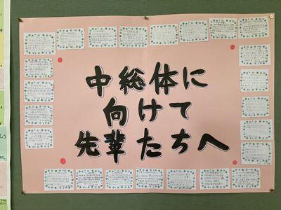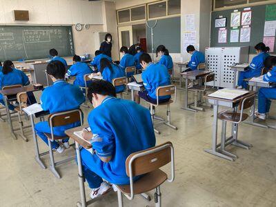 今日は5校時と階中タイムの時間に、校内席書大会が行われました。参加したのは、各学年から選出された代表7名です。開会式のあとに、それぞれが練習で培ってきた力を存分に発揮し、素晴らしい作品を次々と書き上げました。今日完成させた作品から、一人2点を市の書きぞめ審査会に提出します。24日からリアスアーク美術館で行われる市立学校書きぞめ展に出品されますので、ぜひご覧いただきたいと思います。