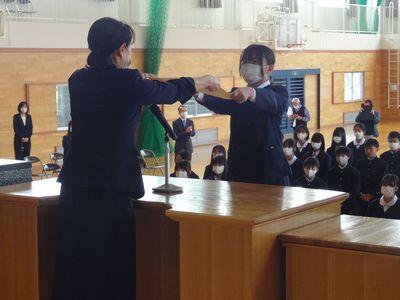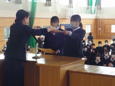 昨日の全校集会の中で、生命保険作文で宮城県第1等を受賞した大友さんと、県造形教育作品展で入賞した平田さん(どちらも3年生)の表彰式を行いました。すばらしい頑張りでした。受賞、おめでとうございます!