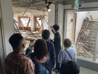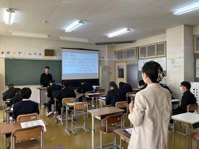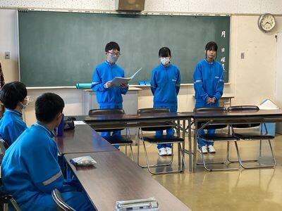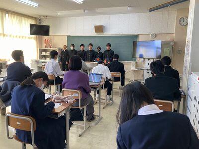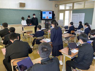 今日の3・4校時に、東北大学災害科学国際研究所の佐藤様、新家様、まるオフィスの4名の皆様にご来校いただき、探究学習課題発表会を行いました。