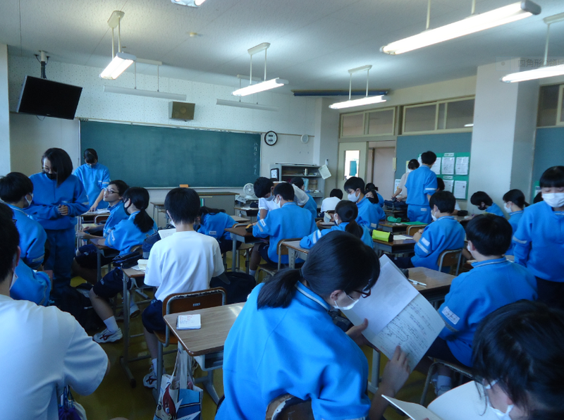 1年生の英語は教科書のUnitを全て終え、先週からは、これまで学習したことを使って、「思い出の行事について英語で発表する」という課題に臨んでいます。今日は、3文以上という条件のもと、学習したばかりの「過去形」を使いながら、各自、原稿づくりに取り組みました。運動会について表現した生徒が最も多かったようです。合唱コンクールや入学式について表現した生徒もいました。原稿が完成したら、クラスで発表したり質問し合ったりする予定とのことです。