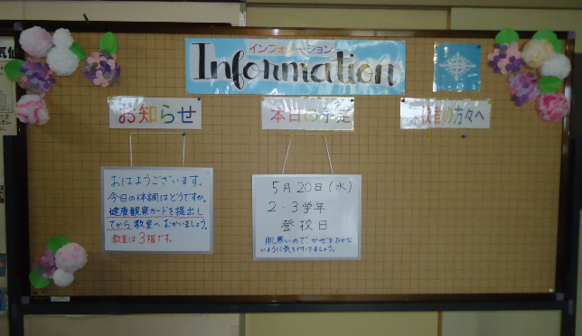 今朝、学校に来てみたら、玄関前掲示板の飾りがコスモスから紅葉に変わっていました。色合いがきれいで見とれてしまいます。本校の用務員さんが作成してくださいました。秋も深まってきました。今年こそ、紅葉を楽しみたいと思っています。