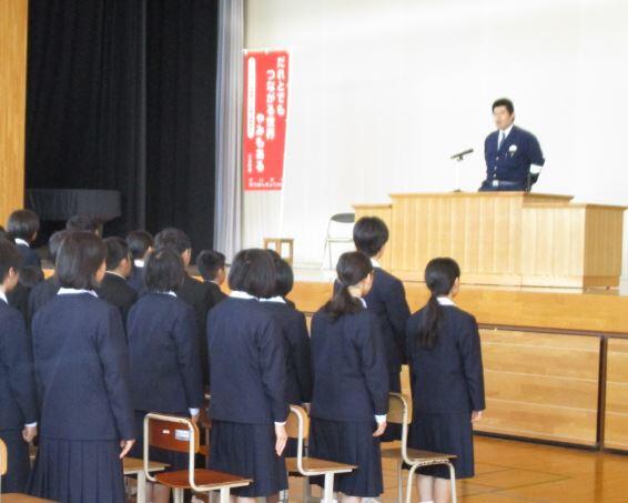 その後、少年消防クラブ入団式をリモート形式で行いました。気仙沼消防署長さんからは、「みなさんは現在の防災戦士としてすでに活躍しています」「自分自身で判断して行動できる人になってほしい」「自助の力をしっかり身に付けほしい」と激励されました。最後に、生徒会防災委員長が、消防署長さんを前に、少年消防クラブの一員として、自分と人の命を守ることができる未来の防災戦士を目指して、これからも活発に防災学習をしていくことを誓いました。