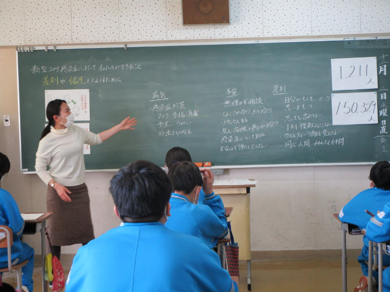 3,4校時,3年生が,全国の先生方が参加するアクサユネスコ協会減災教育プログラムオンライン教員研修会で発表しました。