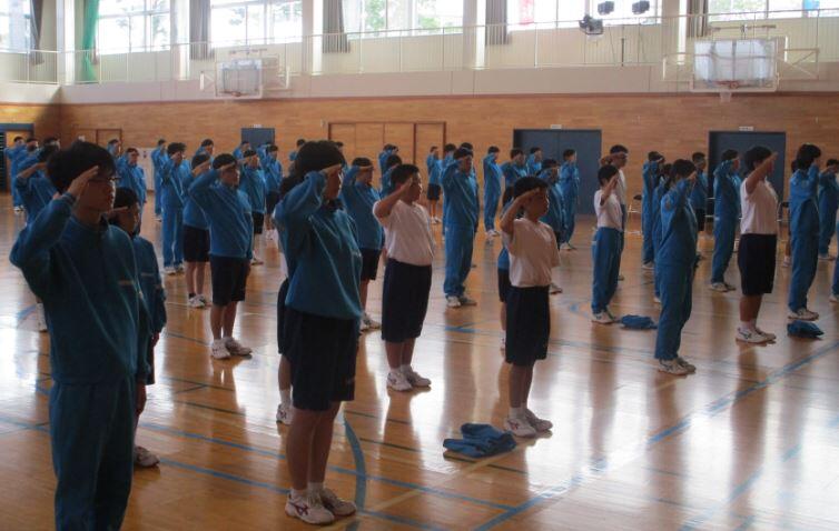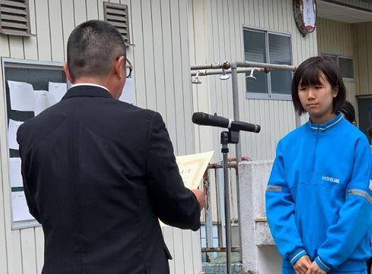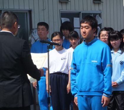 その後、少年消防クラブ入団式をリモート形式で行いました。気仙沼消防署長さんからは、「みなさんは現在の防災戦士としてすでに活躍しています」「自分自身で判断して行動できる人になってほしい」「自助の力をしっかり身に付けほしい」と激励されました。最後に、生徒会防災委員長が、消防署長さんを前に、少年消防クラブの一員として、自分と人の命を守ることができる未来の防災戦士を目指して、これからも活発に防災学習をしていくことを誓いました。