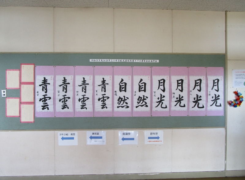 連日、三陸新報で気仙沼市立小中学校児童生徒書きぞめ展の入賞者が紹介されています。入賞した皆さんの力作が今日から校舎内(2階掲示板)に掲示されています。