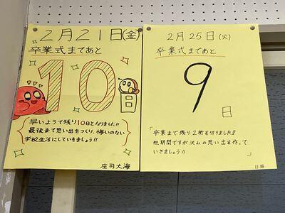 3年生の教室内や廊下には、卒業までのカウントダウンカレンダーが貼られています。昨日でいよいよ一桁となりました。カレンダーには、入試を控えて緊張感が漂う中にも、「卒業までの間は仲間とともにたくさんの思い出を作ろう!」という一人一人の思いが感じられるコメントが多くあります。残された階上中での時間を大切にしてほしいと思います。