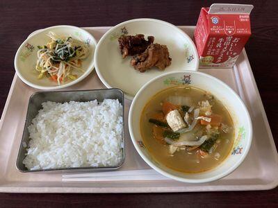 ごはん 鶏肉のからあげ 大豆もやしのナムル チゲ風スープ 牛乳 780㎉
