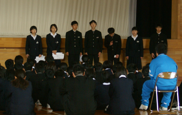本日の生徒朝会は,いじめについて全校生徒で考えました。「いじめ0の学校」を作るために,日頃からどのような取組ができるか各学級で話し合った内容を報告した後に,「自分が言われて嬉しかったこと」「人とのコミュニケーションで気を付けていること」について各学級の生徒が発表し,全校で意見を共有しました。生徒会総務は,「一人一人の個性を理解することが大切であり,話し合った内容をすぐに実践していくことで,みんなが楽しく生活できる学校を目指しましょう。」と話しました。