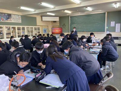 今日の授業のねらいは、回路とはどういうものかを理解することと、回路図を理解することの2本立てでした。はじめに回路のはたらきを実験を通して考え、豆電球が光ったときの回路図をノートに記入しました。そのあとに、電気用図記号というものがあり、直流電源やスイッチ、電球、抵抗器などの8つの回路用図記号を確認し、理解を深めました。今日の1番の盛り上がりは、むき出しの豆電球、乾電池、クリップ(2つ→1つ)を使って、豆電球を光らせる実験でした。どの班も協力し、知恵を出しながら夢中で実験に取り組む様子が見られました。