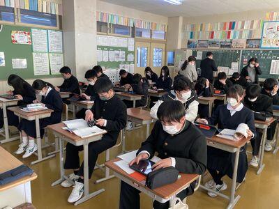 学習テーマは「世界遺産・地域遺産を英語で紹介しよう」です。もちろん英語でです。タブレットを活用しながら、調べ学習を行い、文法に気をつけながら作業を進めていました。白神山地や、万里の長城などをテーマに考えている生徒がいて、英語の時間でありながら様々なことを学べる、とても興味深い学習内容でした。完成が楽しみです。