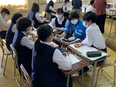 1,2時間目,探究学習コーディネーターの成宮崇史さん,加藤拓馬さん,三浦亜美さん,インターンの黒沼優樹さんにきていただき,調べ学習を行いました。インタビューや調査活動の下調べをしたり,アンケートを考えたり,似たようなテーマのメンバーで話し合ったりしました。
