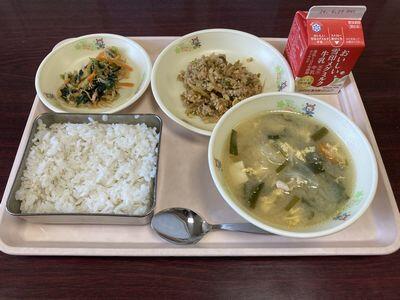 麦ごはん 肉みそ チンゲン菜の和え物 かきたま汁 牛乳 752㎉