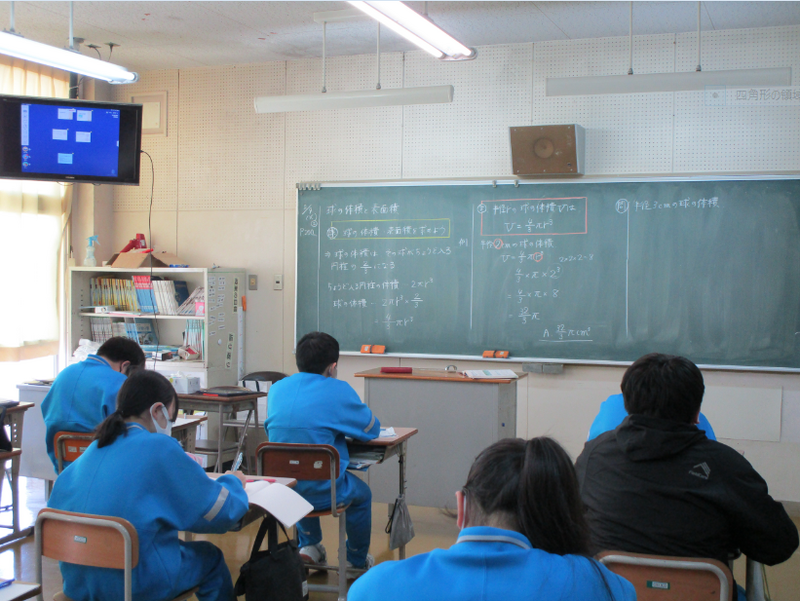 今日は、1年生の数学の授業を紹介します。教科書も終わりに近づいてきました。1年生は今、球の体積の求め方を学習しています。タブレットに送られてきた「体積の求め方」を表す式に、自分なりに書き込みを入れながら、理解を深めました。その後、演習問題に黙々と取り組んでいました。