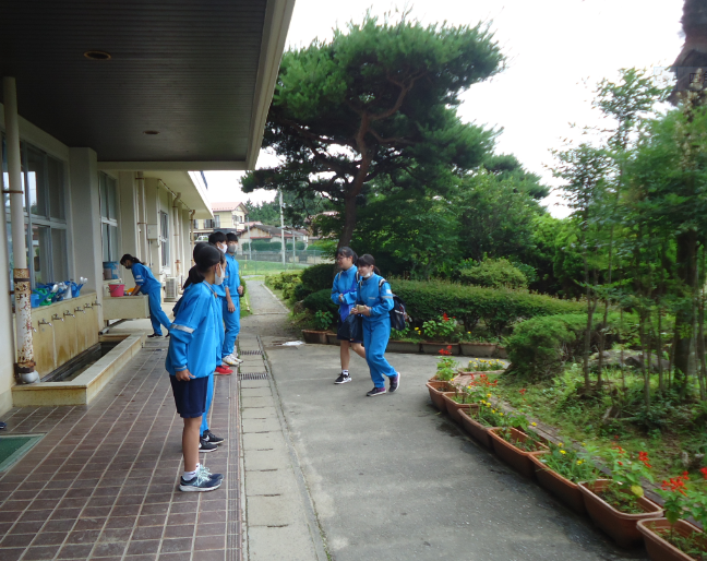 今朝、外に出てみたら、緑化委員の皆さんがお花の水遣りをしていました。学年毎にチームをつくり、交代しながら毎日活動しています。また、生徒会によるあいさつ運動も毎朝、継続しています。