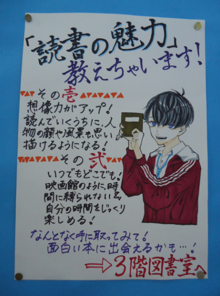校舎内にこんなに素敵なポスターを発見しました。図書委員さんが作成したものです。生徒たちの作品には、不思議なパワーが備わっています。図書室に行ってみようと思います。