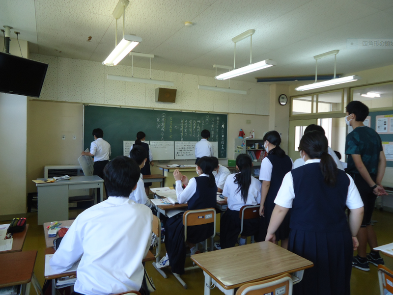 2学期始業式から週3日の7時間授業が始まりました。左側の写真は1年生、真ん中は3年生の7時間目の授業の様子です。授業の終わりは3時55分です。集中力を切らさず、本当によく頑張っています。右側の写真は2年生の帰りの会の様子です。2年生は学級全員で忘れ物ゼロを目指しています。互いに自分でとったメモを見せ合い、明日の持ち物について確認し合っていました。7時間授業は10月末頃まで行う予定です。