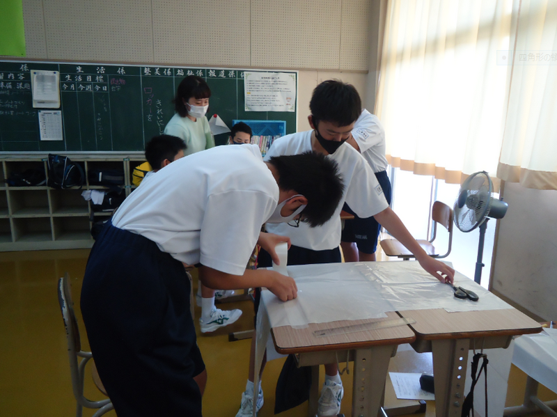 1学年の総合的な学習の時間では、防災学習に加え、福祉学習にも取り組みます。今日は、その一環として「防護服づくり」に取り組みました。本校では1学期に気仙沼つばき会の方を講師としてお招きし、防護服づくり講習会を行っていました。つばき会の方々からボランティアの素晴らしさや楽しさを学び、それ以降、「医療従事者の方のために100着を完成させる」ことを目標に3年生の厚生委員が放課後を使って少しずつ作成していました。今回は、1学年担当の先生方が、福祉学習の一環として、ぜひ1年生全員に取り組ませてみたいという希望から実現しました。教室をのぞいてみたら、1年生の皆さんは、協力性を発揮し、楽しそうに取り組んでいました。