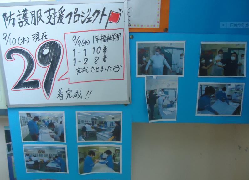 生徒会厚生委員会が「防護服支援プロジェクトコーナー」を作成しました。 目標の100着達成を楽しみにしています。