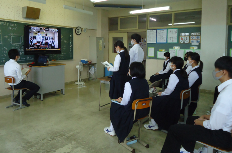 本日、アクサユネスコ減災教育プログラム教員研修がリモート形式で行われ、本校3年生が参加しました。最初に生徒会防災委員の生徒が中心となり、本校の防災学習と昨年度から有志の生徒たちがボランティアとして取り組んでいる気仙沼市東日本大震災遺構・伝承館の語り部ガイド活動について紹介しました。その後、この研修に参加されている全国の先生方からの質問に答えるという形式で交流しました。問われたことに対して、じっくり考えたり、自分の考え・思いを発表したりと有意義な時間となりました。