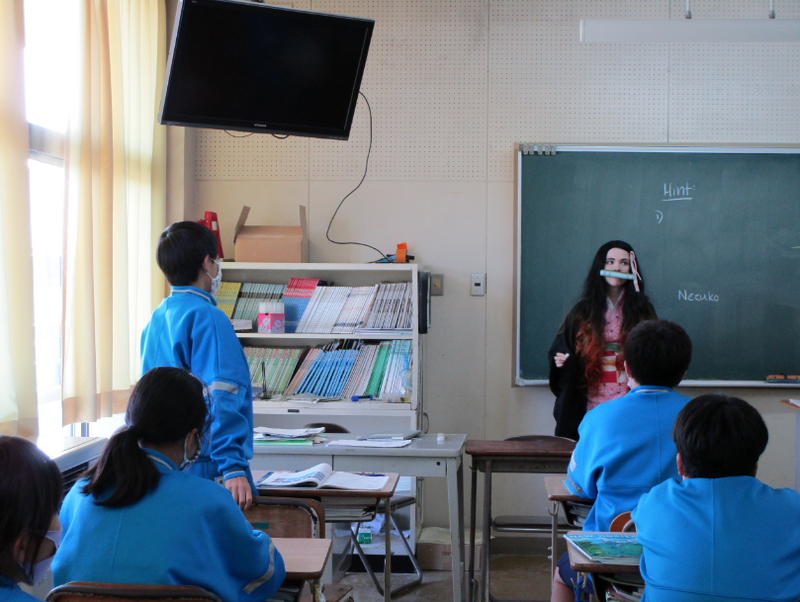 明日31日は、ハロウィンの日。そこで、今日は、ALTのケイト先生が今話題の「鬼滅の刃」の「ねずこ」に仮装して英語の授業をし、生徒たちを驚かせました。アメリカの学校では、ハロウィンの日は、先生も生徒も仮装をして1日過ごすそうです。午前中は普段通り授業がありますが(仮装したままで授業をする,授業を受ける)、午後は、ハロウィンパーティーやパレードを楽しむそうです。帰宅後は、近所を周り「トリックorトリート」と言って、お菓子をいただくそうです。