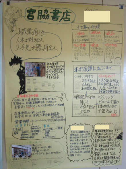 2年生の教室前の廊下には、職場体験のまとめが掲示されています。インタビューしたことや実際に体験させていただいたことを中心にまとめました。