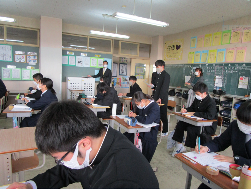 今日は3年2組で道徳の研究授業を行いました。教科書の「埴生の宿」という教材を用いて、「だれに対しても思いやりの心をもって、ともに生きようとする意欲を高める」ことをねらいとした授業でした。今日は、ペアになって自分の考えを伝え合ったり、聞き合ったりする場面を多く取り入れていました。生徒たちは、自分の考えをじっくりと道徳ノートにまとめていました。真っ直ぐなまなざしが印象的でした。