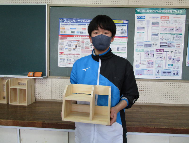 1年生は技術で、多目的ラックを製作しています。自分で描いた設計図をもとに、一人一人が異なった形のラックを作っています。今日は、ベルトサンダーで木材を削ったり、ボール盤で釘を打つところに穴を空けたり、釘を打ったり、やすりをかけたり…様々な姿が見られました。作品を完成させた生徒もいました。