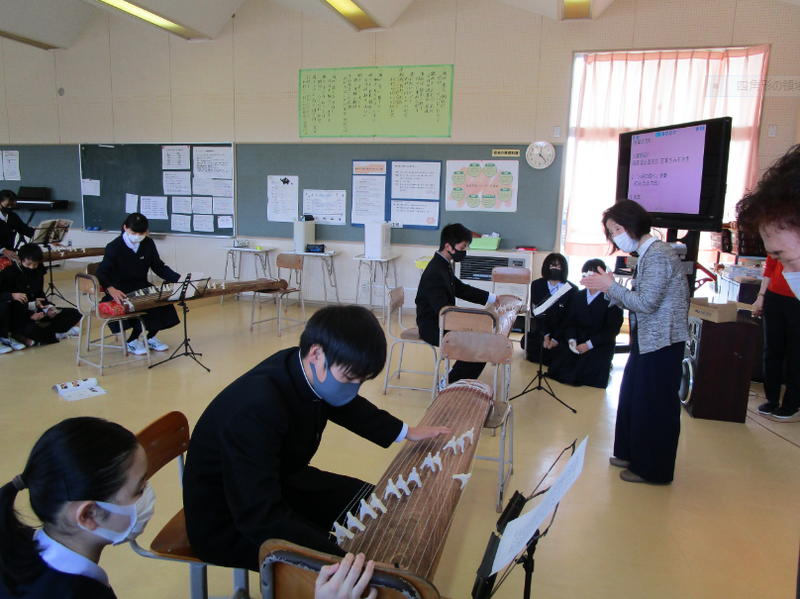 今日は、1年生の音楽の授業で、お二人の講師の先生をお招きし、琴の奏法を教えていただきました。1年生は、これまでの音楽の授業で、「さくらさくら」の演奏に取り組んできました。そして、今日は、さらに難易度が高い「六段の調べ」という曲に挑戦しました。講師の先生に積極的に質問したり、グループ内で助け合ったりしながら、授業の終わり頃には、ほとんどの生徒が初段の部分を上手に演奏できるようになりました。講師の方々には、生徒一人一人に対して、ご丁寧にご教授いただき、本当にありがとうございました。