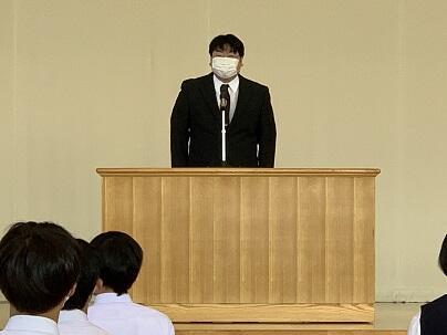 校長先生の紹介のあと,千葉先生から挨拶をいただきました。最後に,生徒代表が感謝と励ましの言葉を述べ,各学年からの励ましの色紙を手渡しました。