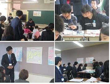授業後の検討会では,宮城県総合教育センターや気仙沼市教育委員会の先生方の指導の下に小中の先生方一緒に4つグループに分かれて協議しました。小中で共通したノート指導や家庭学習のてびきを確立していくなど,今後も学力向上のために小中が連携・協力し合っていくことを確認しました。