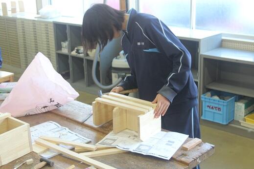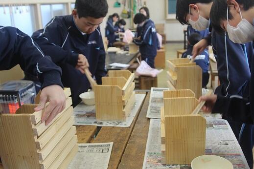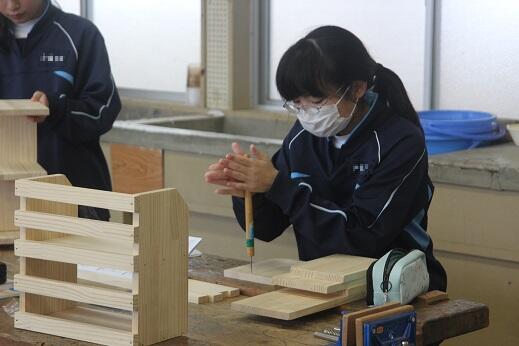 いよいよ、頑張って製作してきた『木工作品(本箱や調味料ラック等)』が完成間近となってきました。ニスを塗る段階まで進んでいる生徒もいました。それぞれの作品に、それぞれの味わいがあります。苦労の跡も『とても良い味』になっているように感じます。よい学習をしています。