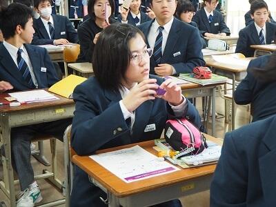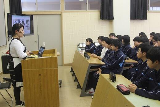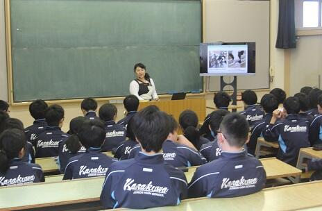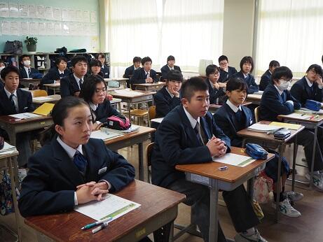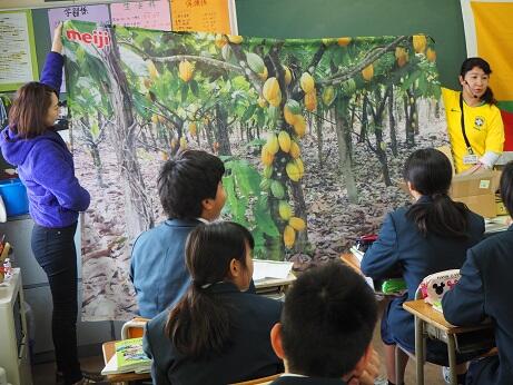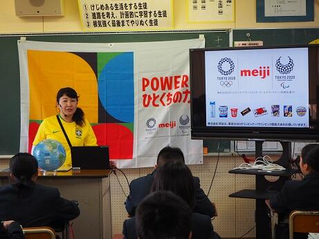 昨日(12/11)の1年生「社会」と3年生「保健」では、株式会社『明治』の食育担当(管理栄養士)の細川里奈様をゲストティーチャーにお迎えし、出前授業をしていただきました。 1年生『社会』は、ブラジル連邦共和国について学びました。日本との関わり、農業、主な農産物カカオ、そしてチョコレートの歴史、国際協力についても学びました。 3年生は、成長のしくみについて知り、明日の体づくりのためにはバランス良い食事が大切であることを学びました。また、身近な牛乳の栄養、そして毎日食べる給食の大事さについても再確認しました。授業後半ではレモンラッシー風ドリンクづくりもし、試飲もさせていただきました。 楽しく学ぶことができました。細川里奈様、ありがとうございました。
