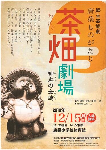 今度の日曜日(12/15)の午後に、郷土芸能劇 唐桑ものがたり 『茶畑劇場 神止の女達』が、唐桑小学校体育館で開催されます。パンフレットを見る(読む)だけで、その劇の面白さが大いに伝わってきます。13:30開場、14:00開演です。今回は唐桑中生徒の出演はありませんが、必見です。   バンフ(表).JPG   バンフ(裏).JPG