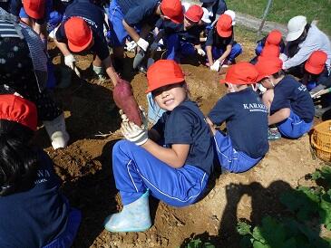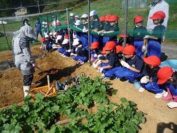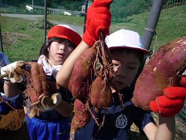 1・2年生がサツマイモほりを行いました。苗植えから管理まで,2名の学校支援委員の方々のお世話でたくさん収穫できました。大きいサツマイモ,変わった形のサツマイモなど,早速,自分たちで掘ったサツマイモを持ち帰りました。お世話いただきました2名の学校支援委員さん方に感謝いたします。