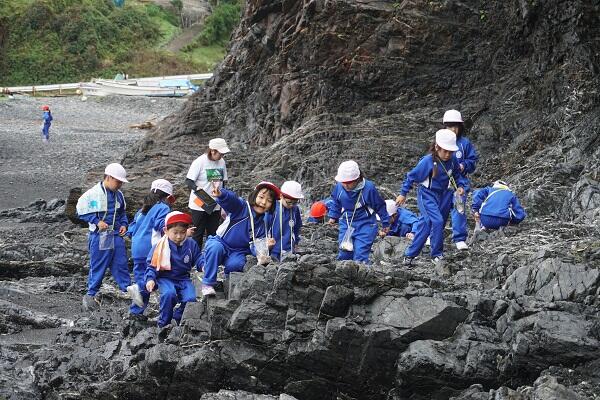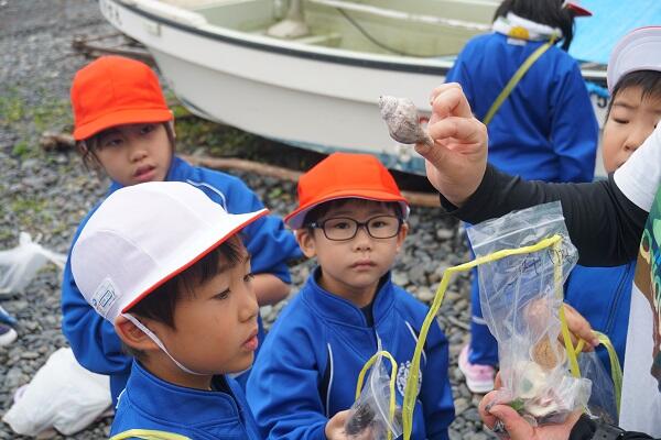 天候状況で延び延びになっていた1年生の「磯遊び」を,ようやく実施することが出来ました。曇り空で波が少し高かったのですが,子供たちは,貝殻や海藻,シーグラスなどを夢中で探したり,イソギンチャクに触ったりと,目を輝かせながら馬場の浜での楽しみを満喫できた様子でした。